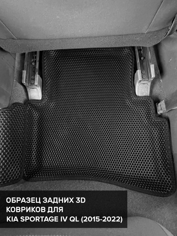 Автомобильные 3д коврики для Kia Sportage IV QL (2015-2022) в салон авто и багажник сделаны из инновационного полимерного материала EVA, изысканная структура в виде ячеек не дает воде, пыли и снегу разлетаться по салону машины и багажнику. 3д коврики зафиксированы на полу определенными клипсами, соответствующими Kia Sportage IV QL (2015-2022), и не двигаются в процессе езды.