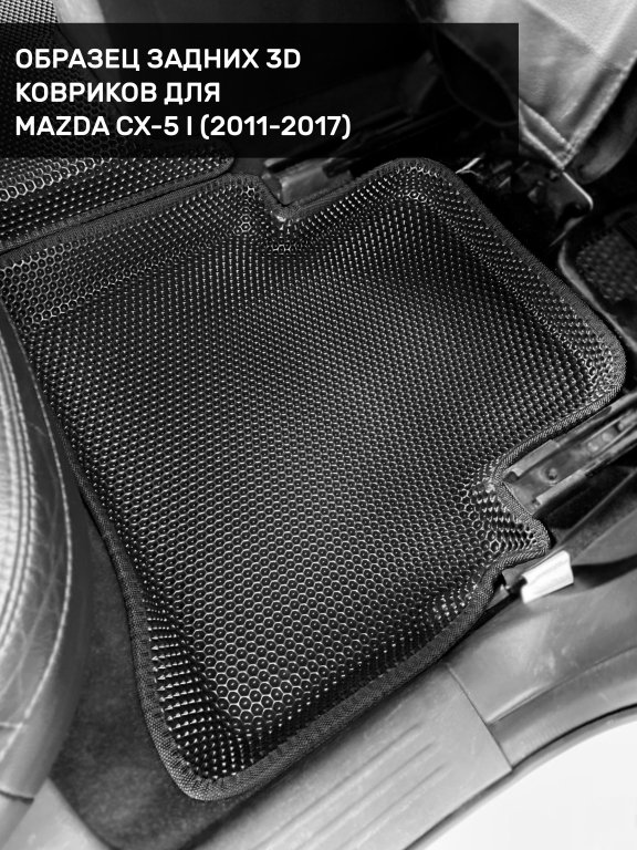 Автомобильные 3д коврики для Mazda CX-5 I (2011-2017) в салон авто и багажник сделаны из инновационного полимерного материала EVA, изысканная структура в виде ячеек не дает воде, пыли и снегу разлетаться по салону машины и багажнику. 3д коврики зафиксированы на полу определенными клипсами, соответствующими Mazda CX-5 I (2011-2017), и не двигаются в процессе езды.