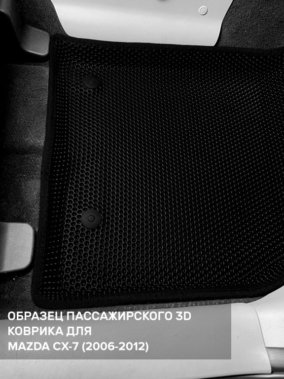 Автомобильные 3д коврики для Mazda CX-7 (2006-2012) в салон авто и багажник сделаны из инновационного полимерного материала EVA, изысканная структура в виде ячеек не дает воде, пыли и снегу разлетаться по салону машины и багажнику. 3д коврики зафиксированы на полу определенными клипсами, соответствующими Mazda CX-7 (2006-2012), и не двигаются в процессе езды.